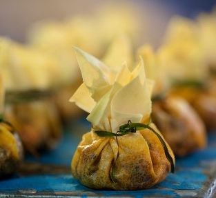 Money Bags Filled with Fried Tofu in Red Curry Sauce
